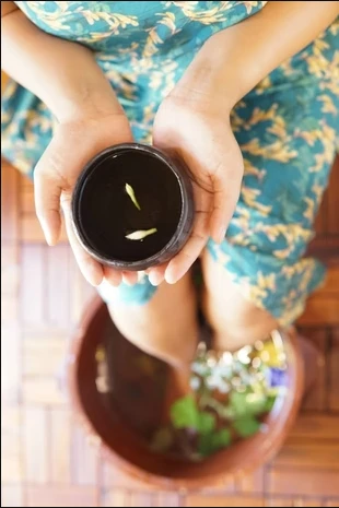 – Soaking in a wooden tub with freshly brewed herbs.