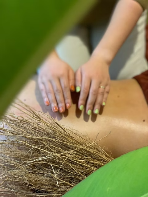 - Relaxation with herbal massage oil and fresh herbs, heated throughout the neck, shoulders, and along the back muscles.